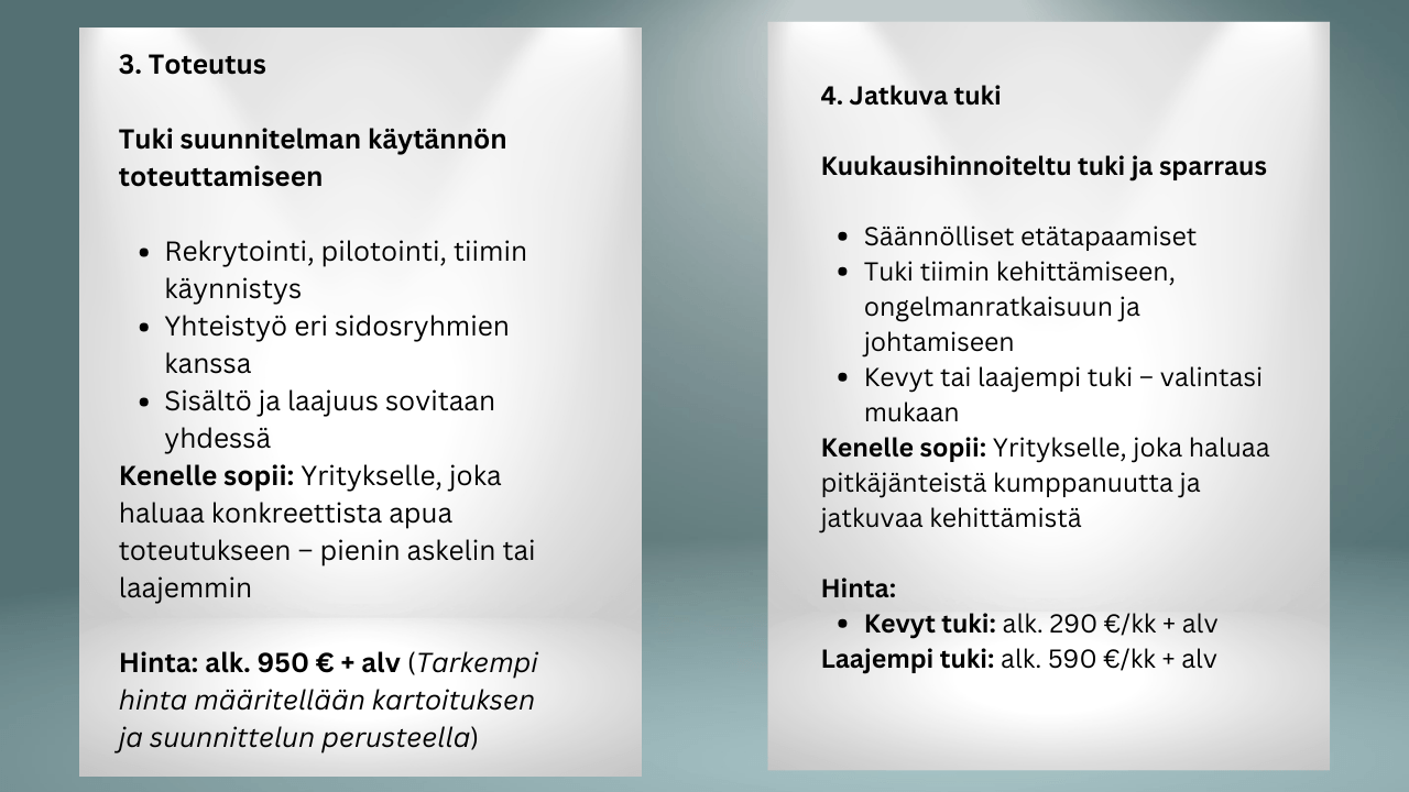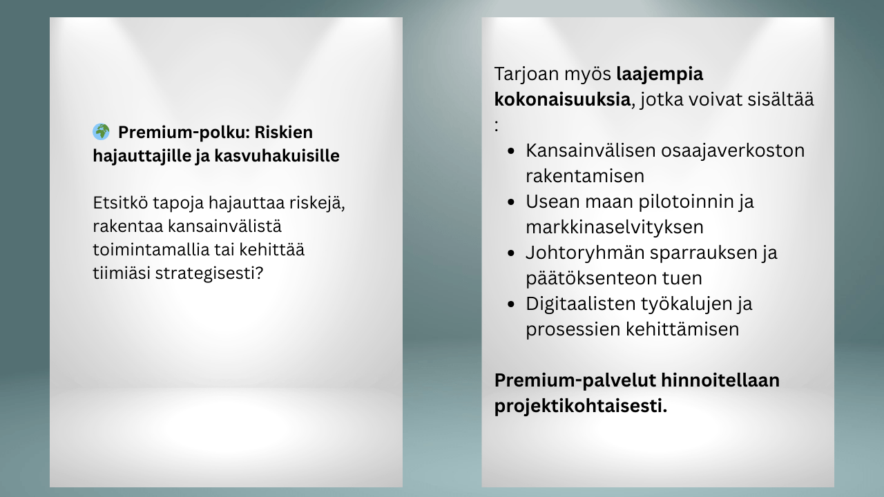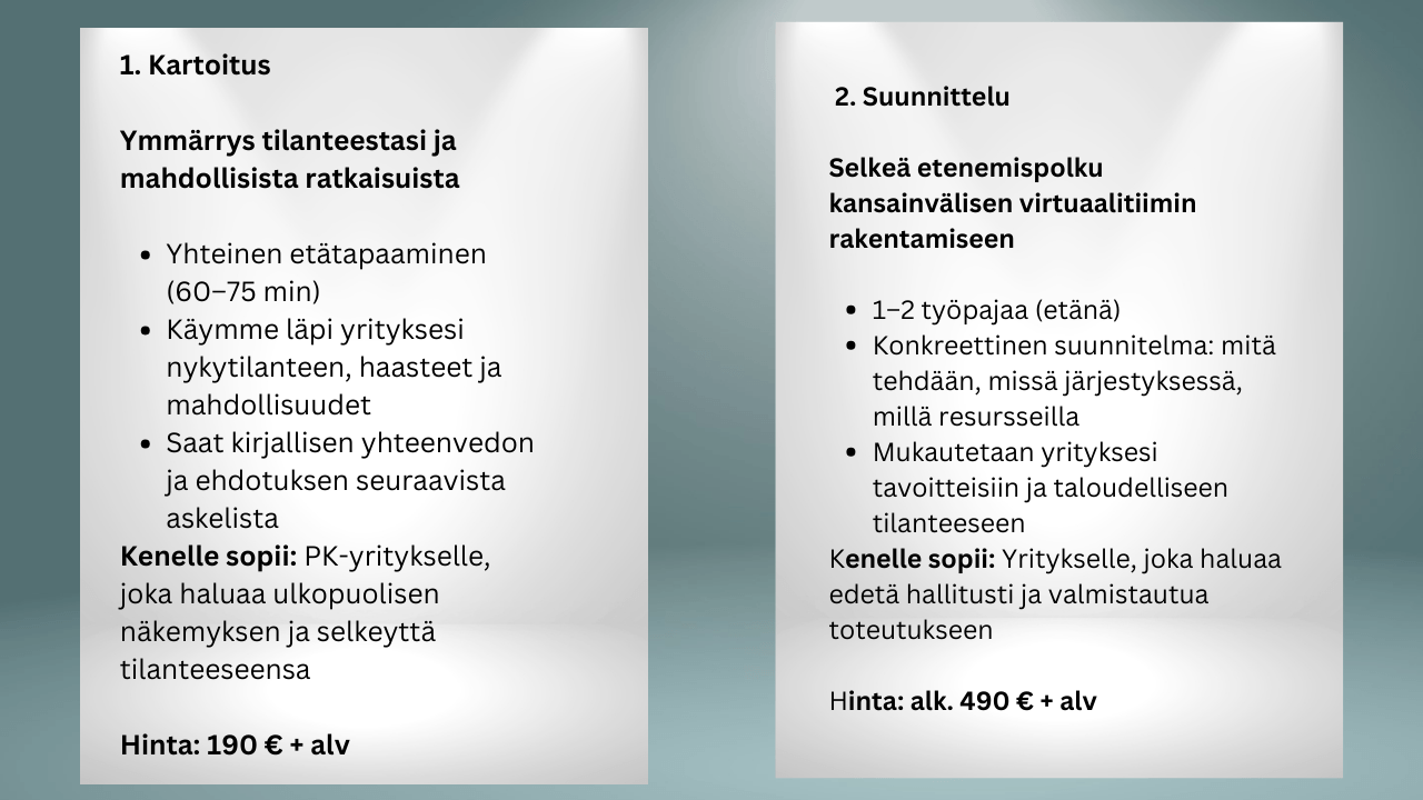 Keskustellaan tilanteestasi ja arvioidaan, soveltuuko kansainvälinen virtuaalitiimi tukemaan liiketoimintaasi ja mitä askeleita siihen kuuluisi.